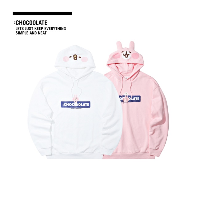 妞編輯特別推坑這一組「卡娜赫拉立體OVERSIZE帽T」,粉紅兔兔款以櫻花粉色打造而成,正中央兔兔擋在:CHOCOOLATE LOGO前,P助悄悄從後面冒出,而P助則是以白色為主,衣服上的LOGO處換成兔兔拉著P助現身,最讓人少女心爆發的是…帽子上直接神還原兩隻小動物的特寫大臉,一穿就讓你直接變身(笑)~