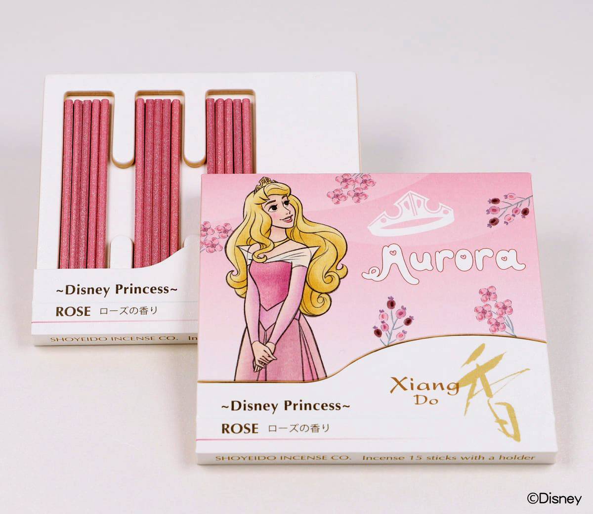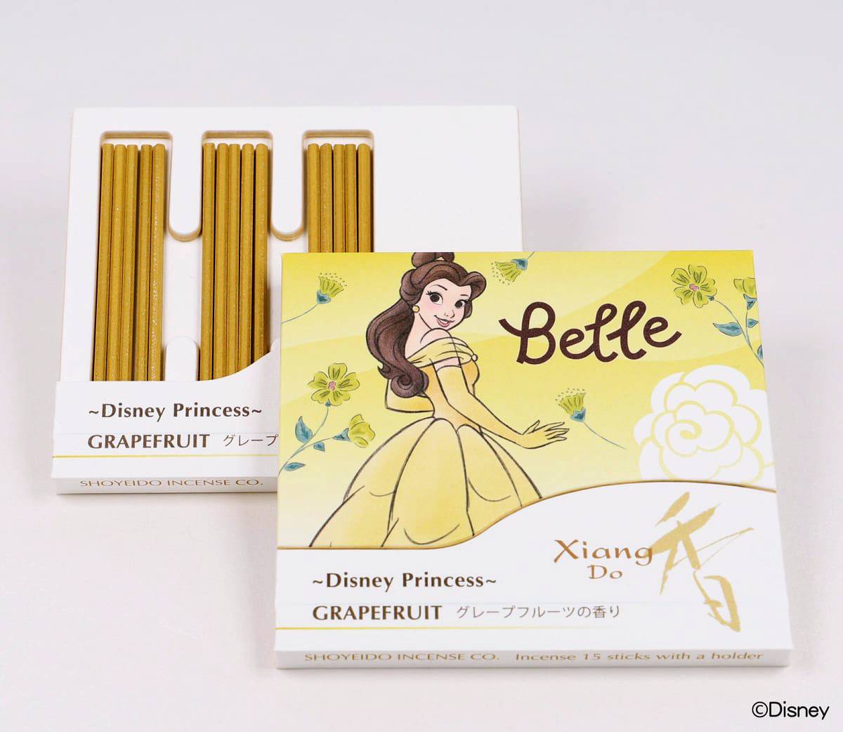 香氣根據每位公主的形象與喜好特別調製,睡美人為「玫瑰」、茉莉為「茉莉」、樂佩是「紫羅蘭」、愛麗兒為「薄荷」,貝兒則是「葡萄柚」,每盒內有15支線香,包裝盒放上她們美麗倩影,精緻得捨不得丟!