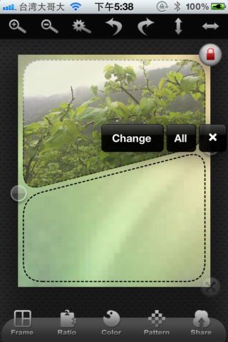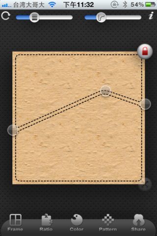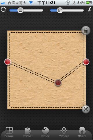 選擇完邊框後,PolyMagic能變化的還不僅如此。雖然是預設好的邊框,不過還是可以讓你就當中的畫面分割位置進行微調。只需要點一下相框右上角的鎖定符號,逼框中每個轉折點就會變成紅色,此時你就可以移動轉折點的位置;或是也可以移動右下角的「x」來調整相框的左右比例。確定後,再按下鎖定符號,就可以固定邊框的設計。