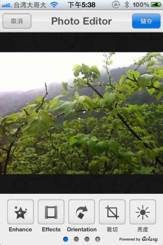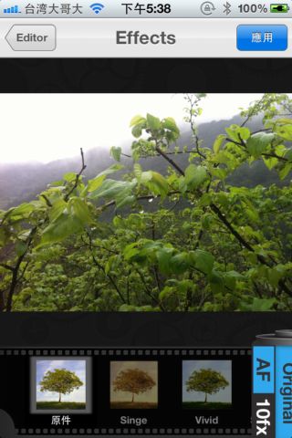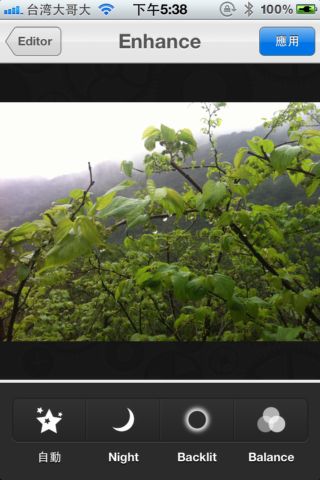 在針對照片進行編修時(你會進入Photo Editor模式當中),點選Enhance可以針對光源進行設定;點選Effects就可以加入11種特效,包含復古或是柔焦等特殊手法,都可以在裡頭找得到!