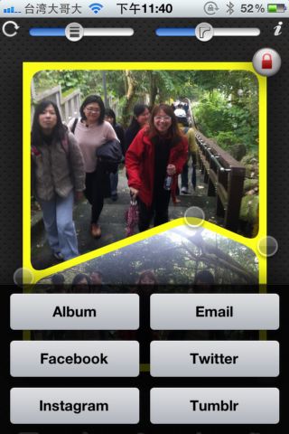 當你好不容易、絞盡腦汁的將所有創意都發揮出來後,當然就是要將你的作品給發步出來囉!PolyMagic支援儲存到相簿、以Email方式寄送、分享到Facebook、Twitter、Instagram及Tumblr四個社群網站的功能。對於台灣的網友來說應該是綽綽有餘啦!選擇完分享方法後,你還可以進一步指定檔案的解析度,超級方便的喔!