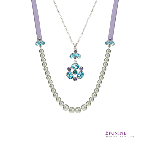 來自海洋深層的唯美呼喚,使Eponine編織出出專屬海洋深層最華麗溫暖的夢境。串連顆顆渾圓飽滿珍珠,巧心搭配高雅柔面潤澤緞帶,打造出海洋氣質,傳遞難以企及的雍容華麗氛圍,巧妙利用色彩視覺原理,將藍、紫與灰等色系自然交織,散發出一股難以言喻的成熟高雅氣質,優雅的長鍊款式,有著豐複視覺層次,施華洛世奇元素璀璨水晶與飽滿珍珠綴飾,有如人魚的眼淚妝點出氣質風情,輕巧而不感沉重,讓頸上的細緻妝點呈現如夢似幻的水漾風情。