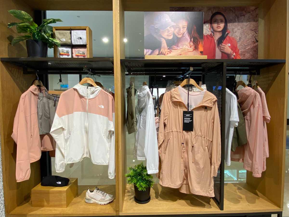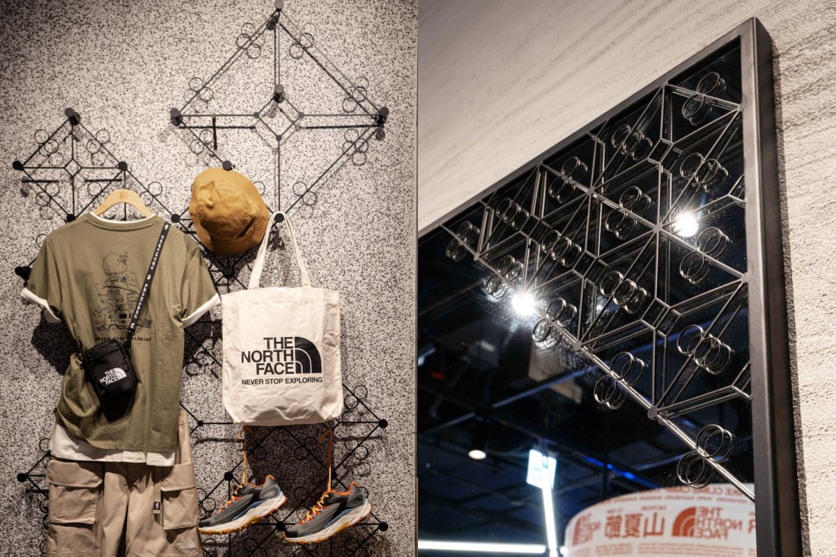 除了齊全的產品線之外,旗艦店的店裝也細心的融入台灣傳統特色,包括老建築中常見的洗石子牆面、特有窗花鐵件成為試衣鏡裝飾以及服裝掛鉤,而品牌的精神標語「Never Stop Exploring 」也成為大片的牆面裝飾。