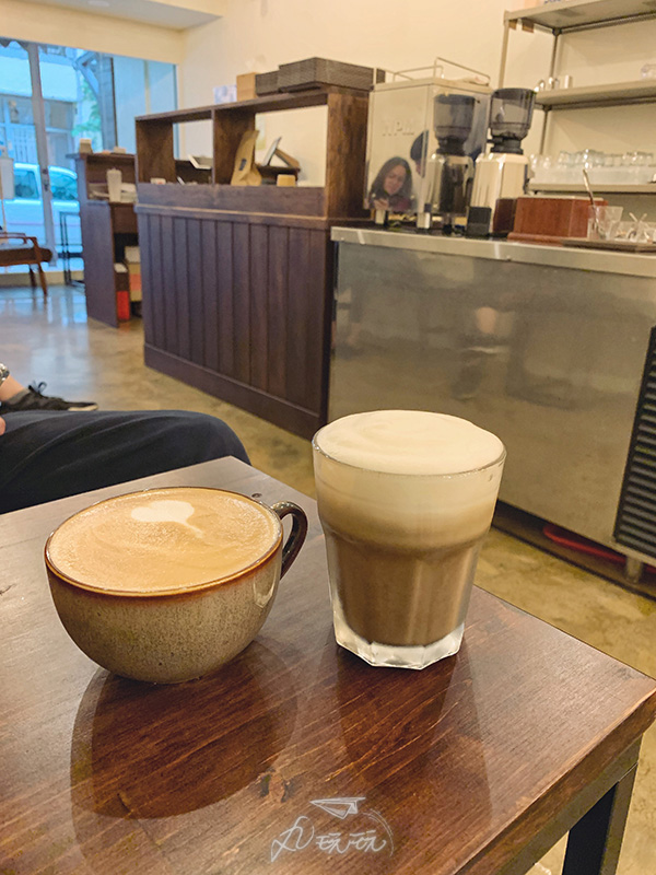 飲品部分為一杯熱拿鐵和冰的紅茶拿鐵。熱拿鐵同樣是由女店主負責,咖啡豆口味溫順搭配小農鮮乳整體中規中矩,雖然沒有漂亮的拉花,但女店主擅長在甜點製作就無需太苛求了。另一杯紅茶拿鐵,以花蓮在地蜜香紅茶所沖泡,搭配在地小農鮮乳所打發的濃厚奶泡,清甜的茶香與綿密奶泡所交織的紅茶拿鐵,我很喜歡。