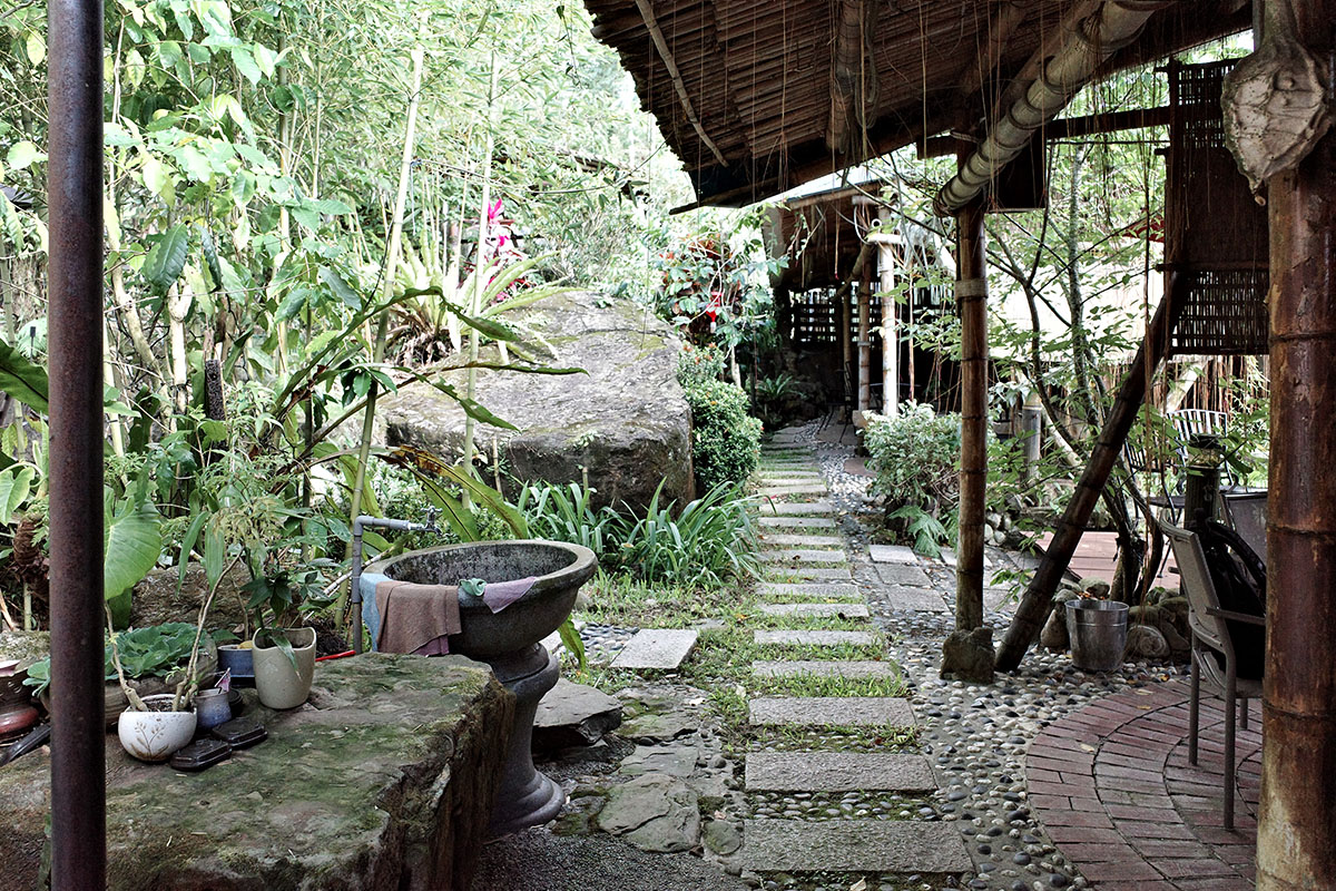 「石墩咖啡」的用餐環境相當特別,四周沒有建材牆壁與玻璃窗遮掩,而是以最親近大自然的戶外座位呈現,簡單的竹藤編椅與石桌再配上周圍的綠蔭紅花環繞,猶如峇里島的露天風情在這就能輕鬆Get!(彷彿身在叢林享用餐點)
