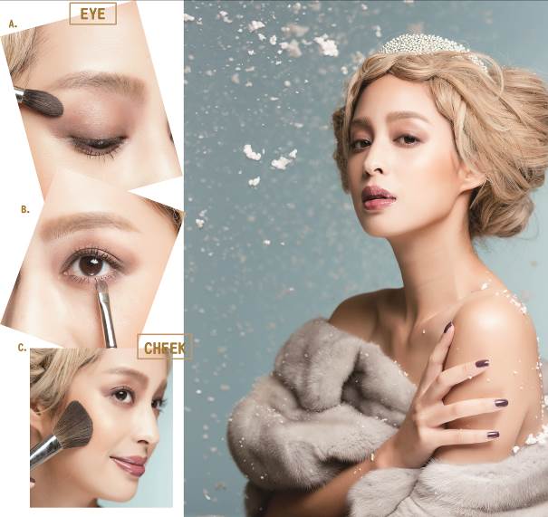 下雪的白色聖誕節一直是眾人心目中的憧憬,在柔軟純淨的雪白大地,最適合採用柔和的低彩度加以裝點。而彩妝也是如此,就運用絲絨質感的眼妝、光澤閃耀的修容,創造出陶瓷娃娃般的高雅純淨感吧!