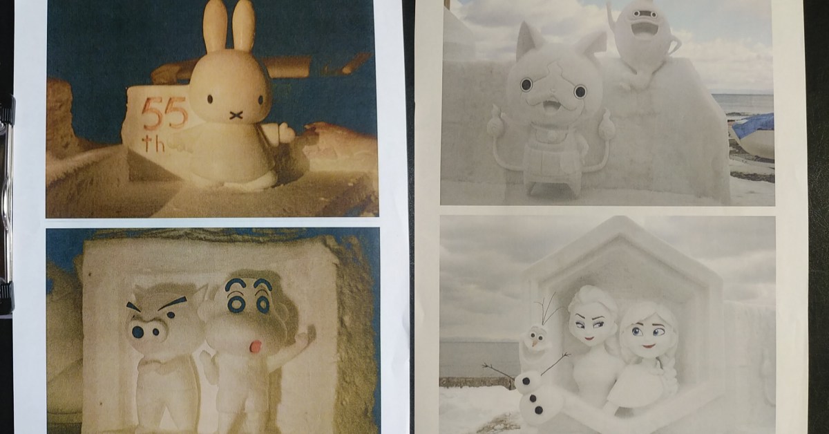 這些可愛的造型雪雕來自釜谷郵便局的局長「安齋先生」,現年56歲的他,每年1-2月都會依照當時的話題角色來創作雪雕,從1998年起已經持續了20幾年(好佩服)!一開始只是為了讓自己的孩子開心,打造出皮卡丘和麵包超人。不知不覺,這樣地「一人雪之祭典」已經在當地成為一個小有名氣的例行活動,「去年的作品好棒啊,今年會是什麼呢?」為了帶給有期待的人們快樂,雖然自己的孩子已經長大,安齋局長還是年年端出讓人驚奇並露出笑容的造型雪雕。