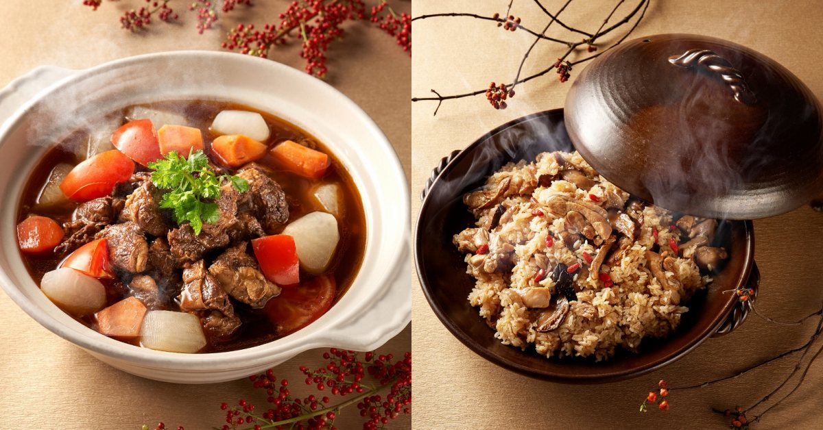 由行政主廚王志孚設計的圍爐桌菜,從前菜、主菜到餐後甜點一應俱全。由行政主廚王志孚設計的多道精緻佳餚,內含招牌蜜汁叉燒、烏魚子、川味海蜇、滷水鴨翅及馬口魚等海陸五款前菜,大器又鮮美的「蒜蒜蔥沖龍蝦身」,膠質豐厚的「潮式豆醬燜石斑」、招牌菜色「福牛三聖聚寶盆」,年夜飯必備鮮湯「粵式胡椒煲雞鍋」,手工年菜「荷葉鮑魚珍珠雞」及節慶甜品,每組12,800元,星級圍爐宴,澎湃上桌。2021年獲米其林一星肯定的米香台菜餐廳主廚陳永華,傳承經典台味,推出多款精選外帶年菜,有年節必備、滿載山珍海味的「一品佛跳牆」,嚴選鮑魚、干貝、台灣土雞腿肉、黑豬肉及鬆軟芋頭等食材,慢火熬煮,湯醇味美。經典手工菜「八寶布袋雞」,將整隻土雞去骨後,於雞肚填塞鮑魚、干貝、金華火腿、海參等八種食材,經八小時燉煮出菁華鮮湯。美福鮮牛新品「米香精燉牛肋湯」,選用肉質軟嫩的澳洲牛肋條,搭配蒜苗、三星蔥、八角、花椒與辣豆瓣醬等食材燉煮約一個半小時,牛肉軟嫩帶有膠質,湯頭濃醇鮮香。還有傳統古早味「白鯧芋頭米粉」、「紅蟳米糕」及「麻油土雞飯」等單品佳餚,自由選搭台式風味團圓菜。