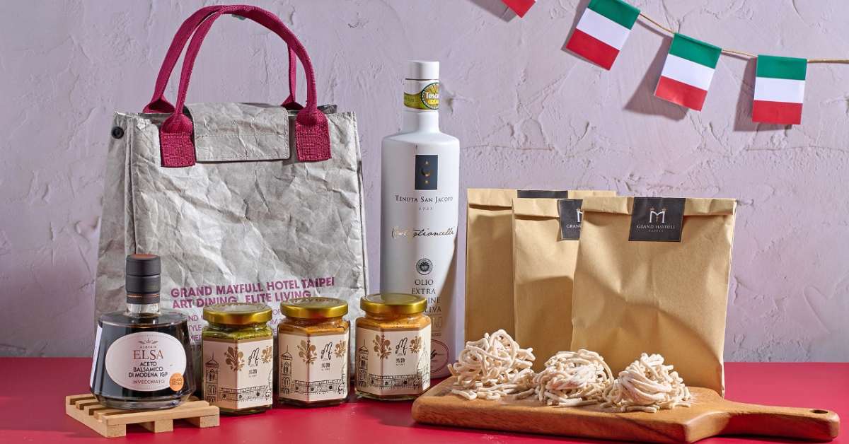甜椒堅果辣醬(150g)、芝麻葉酸豆醬(150g)及和牛肉醬(150g),各乙瓶、手工義大利麵3入(170g/入)、IGP冷壓初榨橄欖油乙瓶(750ml)、IGP陳年巴薩米可醋乙瓶(250ml)
