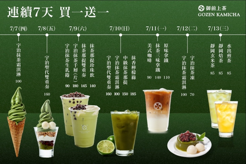 全台最大抹茶專賣品牌「御前上茶」,首家北區旗艦店7月於新竹大魯閣湳雅廣場正式登場,連續7日7∕7–7∕13經典口味買1送1,日系簡約開闊的空間,設有超過50席座位,讓大家在暑假期間不用出國也能品嚐到最道地的日式抹茶風味。「御前上茶」採用道地日本京都宇治抹茶,以飲品、冰品、點心為主軸,嚴選在日本已有180年歷史的京都「森半抹茶」老鋪做為原料,將視覺與味覺交織出經典抹茶風味。