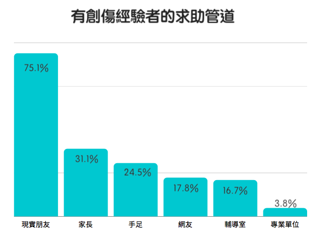 無奈的是,這些有創傷的孩子向專業人士求助的比例並不高,有7成5的人都是向朋友求助,3成是向家長求助,僅有16.7%的孩子會向學校輔道室求助,甚至比求助網友(17.8%)還低。兒盟表示,這問題其實比想像中還要嚴重,因為有很多創傷經驗的孩子問題較為複雜,而具有專業背景的輔導室是孩子們很好的求助對象,也更需要專業的輔導人員介入。