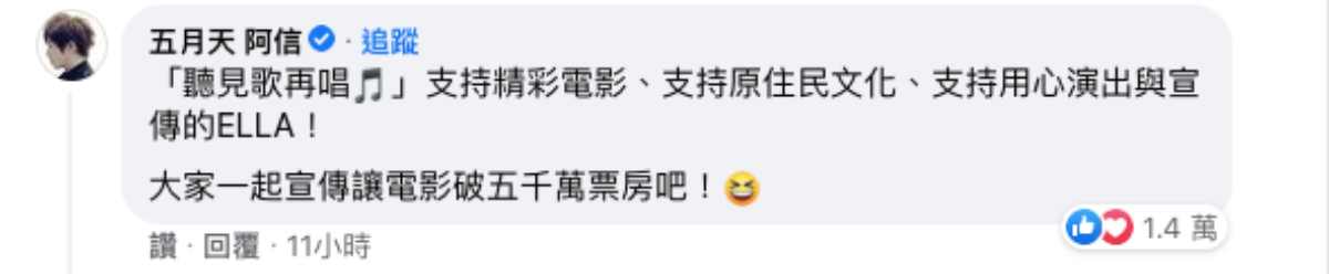 針對Ella的道歉文,五月天的主唱大人阿信直接現身回應表示:「《聽見歌再唱》支持精彩電影、支持原住民文化、支持用心演出與宣傳的ELLA!大家一起宣傳讓電影破五千萬票房吧!」,留言一出秒吸1.4萬讚,並被網友大讚阿信是神救援真暖男!