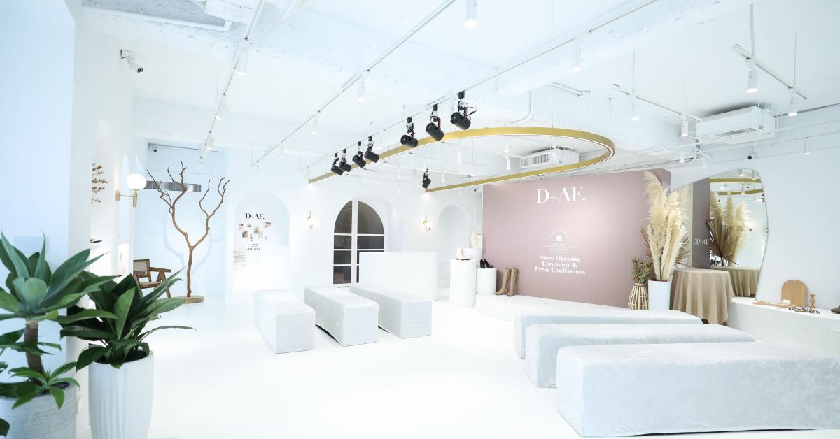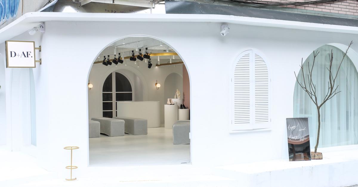 D+AF首間品牌體驗店特別重金聘請屢獲國內外設計大獎的「成舍室內設計」,林欣怡設計師團隊打造女孩們最愛的隱藏版仙境「全台最美鞋店」,以設計理念「less is more」為概念,減少鞋子陳列數量及擺設,並利用自然光線放大整體空間感,營造出輕鬆愜意的購物氛圍。此外,店內還加入純白半圓型拱門設計、天花橢圓燈架、不規則形訂製全身鏡,及讓商品一目了然的梯田式陳列鞋架,在四四方方的空間中,刻劃出層次豐富的圓弧線條;而擺設上,設計師也運用枯木元素,以原材的柔和顏色及天然紋理質感,展示質樸的原始之美,顛覆消費者對鞋子展示空間既有的想像,夢幻氣息讓人彷彿置身異國。