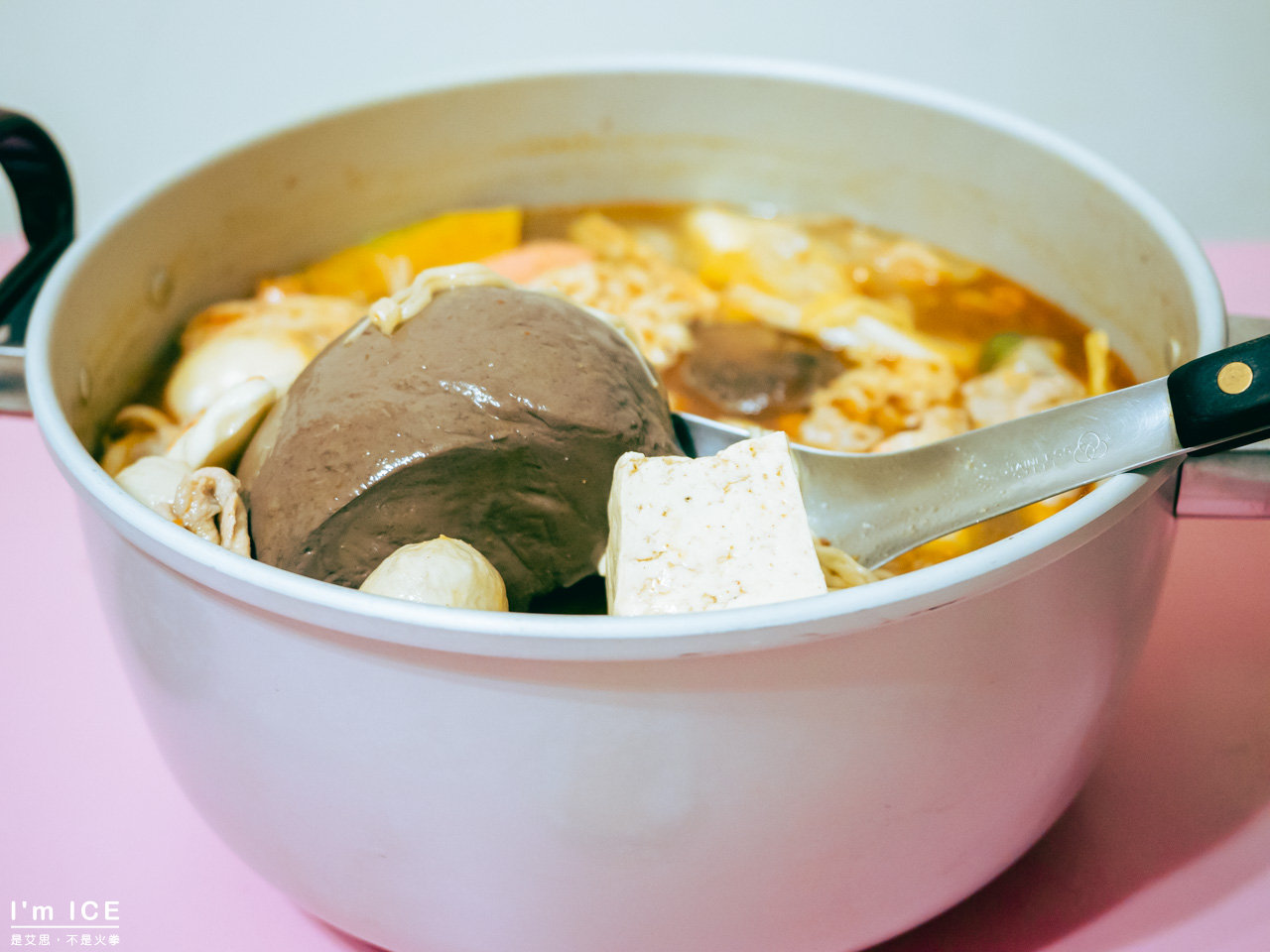 將湯底一倒入鍋內,頓時室內皆是奶香四溢,聞起來不單單只是牛奶味道,竟然還帶點椰香味!?一包湯底包容量約有300g,煮火鍋之時,記得要再加上1,500㏄的清水煮滾後一一放入食材。每份火鍋套餐皆附有火鍋豬肉片(約150g)、火鍋料、綜合蔬菜盒、王子麵、豆腐等食材,夯不啷噹的煮起來也是一大鍋!起司牛奶鍋的味道嚐起來是充滿奶香卻又不讓人覺得膩味,是讓人能吃到最後也不會厭倦的味道。曾經自己煮過所謂的牛奶鍋,只有〝失敗〞兩字可以形容,想說這輩子應該不會再輕易嚐試了,沒想到紅瓦舍的牛奶鍋讓我甚是喜愛啊!