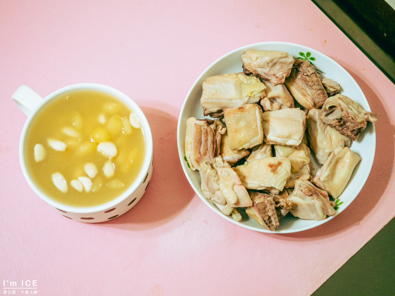 除去香菇雞不說,個人最愛的雞湯就屬蒜頭雞了!有時,心血來潮也會煮個蒜頭雞麵。而紅瓦舍×阿宗師的蒜頭雞是蒜香味十分濃厚的湯頭,再搭配已川燙去腥的低脂雞腿肉!說到川燙去腥,自己在煮蒜頭雞時,真的很煩這個步驟,變成要起兩鍋清水,不去腥及血水又不行,好在紅瓦舍的蒜頭雞已料理完全,只要湯底包再加上3,000㏄的清水放入雞腿肉,滾後再煮個15分鐘就是一鍋可以應付好幾個人吃的雞湯了。