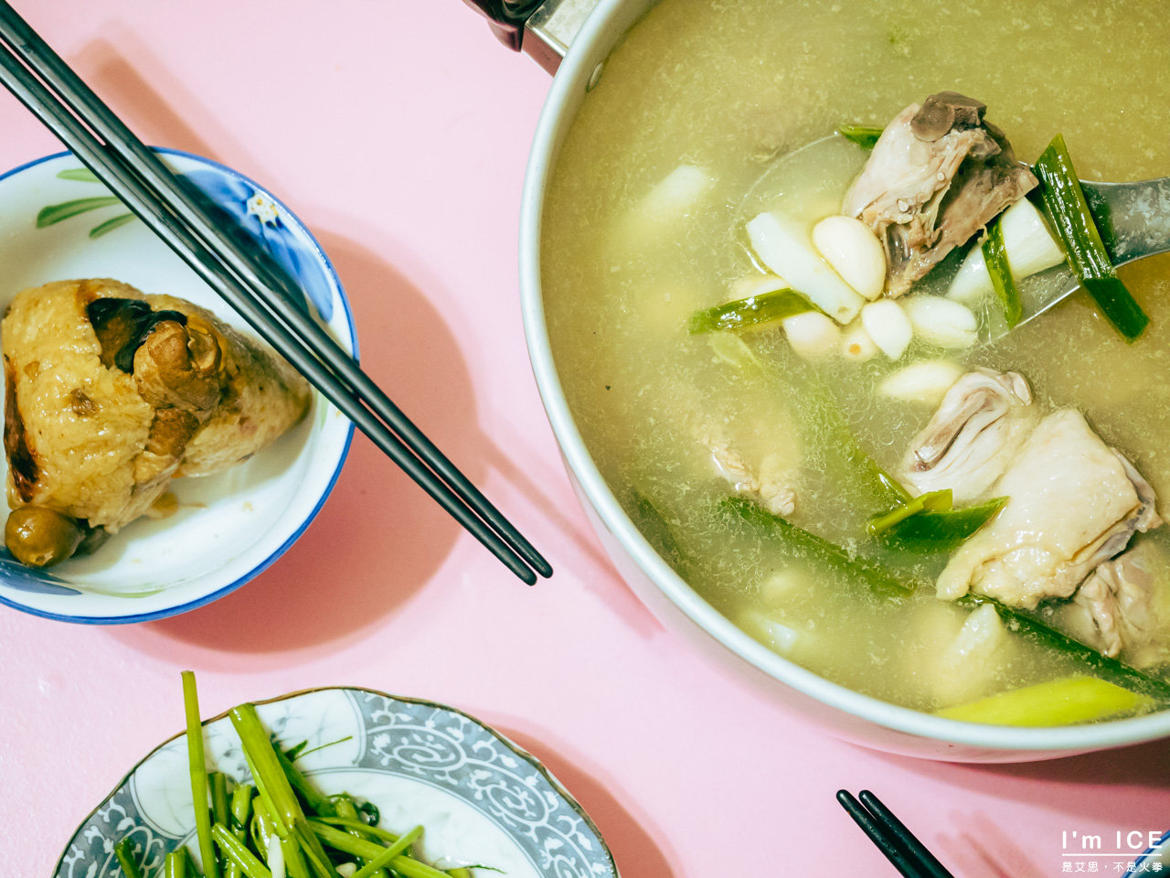 想要有蒜香濃郁的蒜頭雞湯就是得要一半蒜頭炸的金黃、一半為生鮮蒜頭,這樣煮起來的湯頭才會更香!宅配到家的一份蒜頭雞,裡有湯底包及雞腿肉,在端午節的當日,隨便炒個青菜,再蒸兩顆肉粽,把蒜頭雞當雞湯喝,就解決了午餐,而晚餐更是隨意,自加馬鈴薯片及麵條等食材,就又是一碗碗的蒜頭雞湯麵。