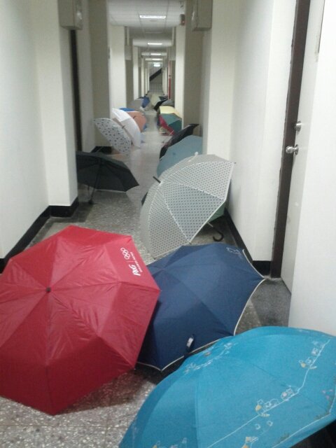下雨天回宿舍時走廊根本無法走動,因為全部都被雨傘占滿滿了!有時候不只雨傘,還有雨鞋、雨衣、安全帽等等,回寢室就像障礙賽一樣。