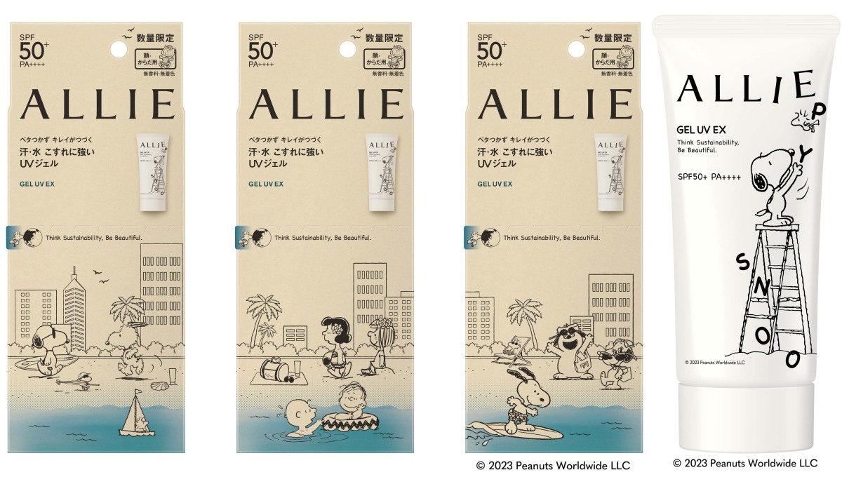 SNOOPY粉今年防曬就鎖定ALLIE!去年就曾與卡通角色-PEANUTS花生漫畫》中的SNOOPY聯名,今年又特別把熱賣的「ALLIE 持采UV高效防曬水凝乳EX」,及臉部輕底妝「濾鏡調色UV防曬」,各推出各3款SNOOPY限定包裝,搭配海洋風格插畫,滿滿的夏日感。包裝外盒千萬別急著丟,只要發揮小巧思就能變身收納盒、名片盒,防禦肌膚的同時還能環保愛地球。