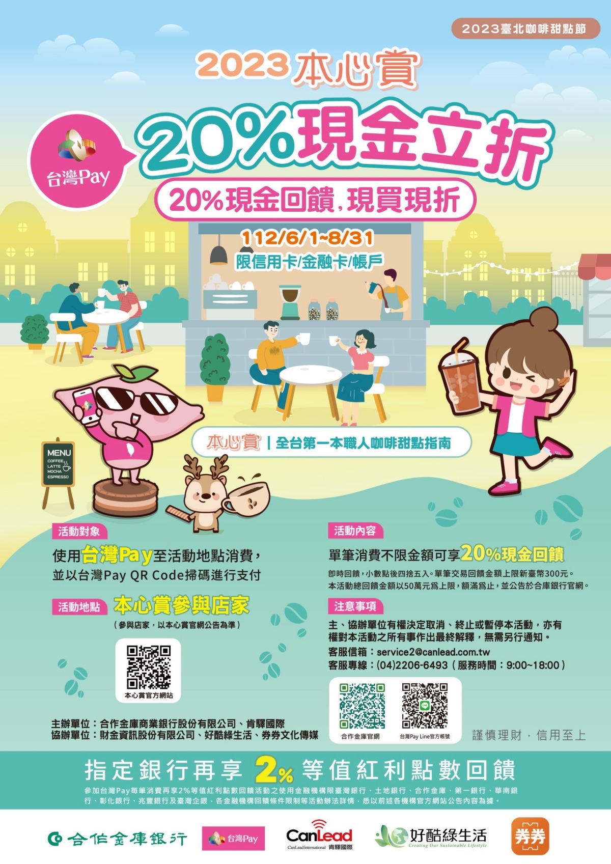 本心賞2023不愧是職人咖啡甜點指南~每一個口袋名單都超想去啦!但看看乾扁的荷包真的會讓人選擇困難QQ,女孩們先別擔心~這次本心賞2023與台灣Pay合作,只要在活動店家消費並以台灣Pay支付,不限消費金額立刻享有20%超高現金回饋,而且是現買現折即時回饋,聽到這超級划算的優惠,小資女們這週末就快揪閨蜜們衝吧!