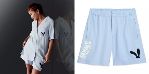 跟平織布襯衫同套組的「幸運兔奧斯華女士短褲」,右左邊褲管分別為「幸運兔奧斯華」和「奧斯華耳朵」的網版印刷,褲長至大腿中央,而且特別採用彈性腰帶搭配鈕扣開合設計呢!