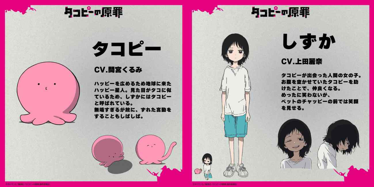 擁有粉紅章魚外型,個性純真討喜的章魚嗶,本名為「嗯烏耶依努kf」。來到地球的目的,即是想將快樂和幸福帶給大家。而章魚嗶時不時就會掏出的「HAPPY道具」也都相當新奇。這樣的設定不免讓人聯想到,同樣會拿出各式道具解決主角疑難雜症的哆拉A夢。只不過,與其風格大不相同的故事內容,則是讓《章魚嗶的原罪》被稱為「惡夢版哆拉A夢」。