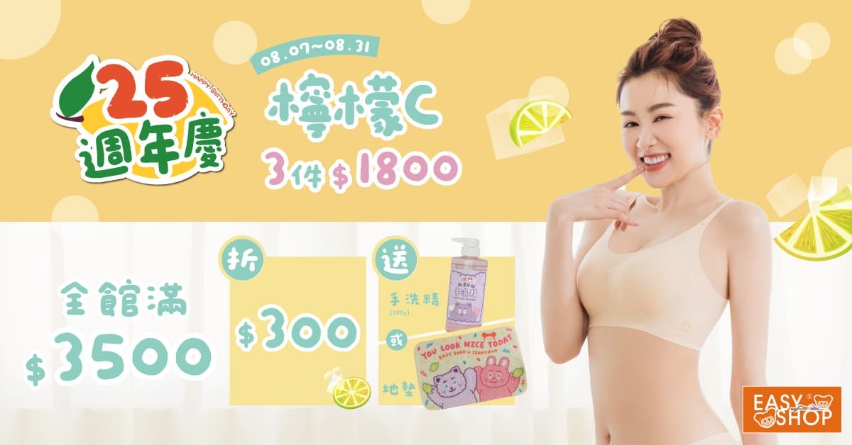 EASY SHOP 25歲生日快樂!引領台灣內衣潮流四分之一世紀,EASY SHOP始終陪伴每位女孩的成長與蛻變,25週年慶強勢登場,全台門市、官方網站及各大電商平台自8/7(四)至8/31(日)歡樂開跑,多款超值優惠、獨家新品、好禮滿滿,要妳美得有感,買得超值!EASY SHOP 25週年慶獨家巨獻煎妮花聯名第二彈「檸檬維C」舒適系列、還有「Audrey柔曲」等多款指定商品買一送一。EASY SHOP不只會做內衣,也非常懂「生活儀式感」,默默在每個細節藏入驚喜,這次週年慶贈品可愛實用到讓人忍不住尖叫,活動期間單筆消費滿3500元,除了現折300,折扣後滿額還加碼贈送煎花聯名手洗精或可愛爆棚地墊,數量有限,送完為止。