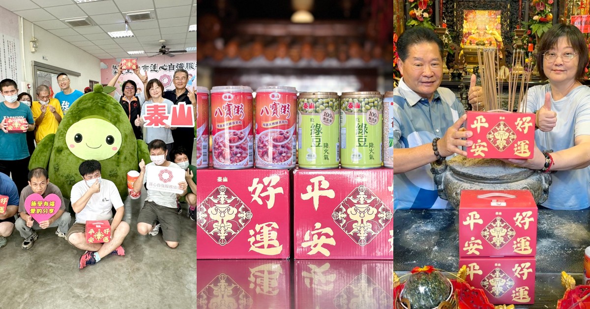 泰山75年來在眾多消費者的喜愛與支持中一步一腳印的累積了企業資產,在中元檔期更希望能持續存好心做好事,回饋社會。今年特別攜手大甲鎮瀾宮、北港武德宮兩大宮廟舉辦「平安好運」公益活動,將贊助普品捐贈予當地弱勢團體,以實際行動傳遞溫暖關懷,守護社會角落的每一份需要。此次捐贈的「泰山平安好運禮盒」2000箱,禮盒內含八寶粥3罐、綠豆湯2罐及自然就好花生湯1罐,皆為泰山熱銷點心,營養豐富且方便食用,期盼為弱勢族群補給能量、帶來滿滿好運。