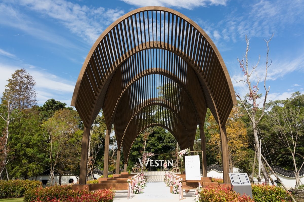 桃園大溪笠復威斯汀度假酒店擁有少見弧形原木教堂,打造唯美童話婚禮不是夢!圖/ 大溪笠復威斯汀提供