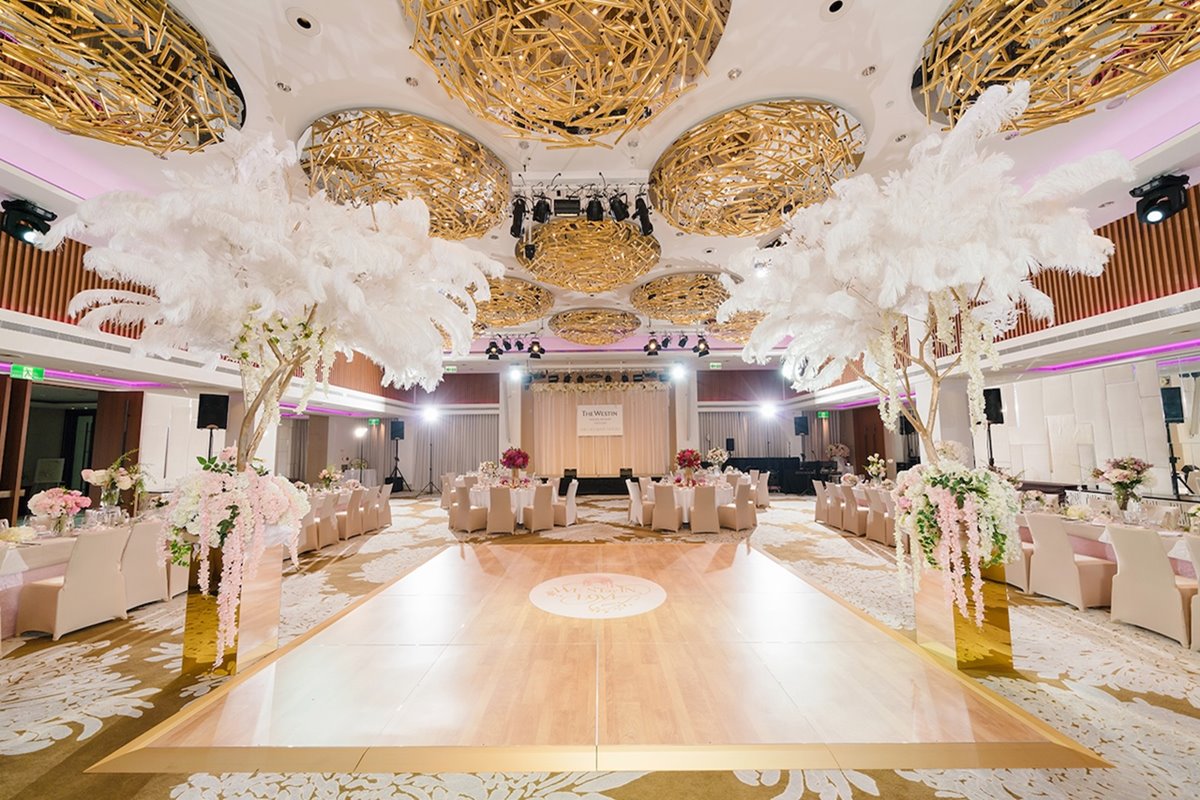 桃園大溪笠復威斯汀度假酒店豪華宴會廳挑高 5 米空間,可容納 300 位賓客、規劃出不同功能性場地。圖/ 大溪笠復威斯汀提供