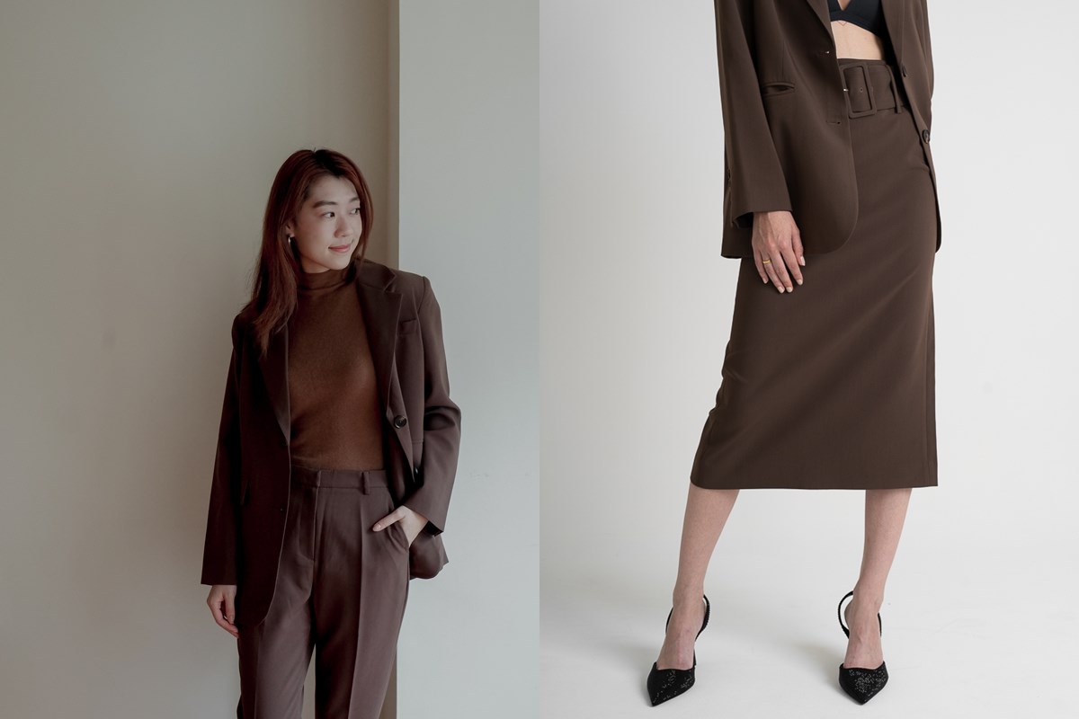 主理人Sydney選用最襯亞洲人肌膚的暖調深咖啡色設計而成的西裝套裝,以經典修身的oversized西裝外套,率性俐落的九分老爺褲,知性優雅的開衩高腰窄裙,搭配冬天推出的泰迪熊棕色系的羊毛高領上衣,以不同質地的面料和些微的深淺差異,交織出一套極簡沈穩的美拉德色系套裝。為了符合亞洲身形而量身打造的完美比例西裝套裝,不論是褲裝或是裙裝,都能夠有效修飾跨髖、梨形身材友善。同時加入了許多細節,在穿搭好看之餘也能舒適活動。