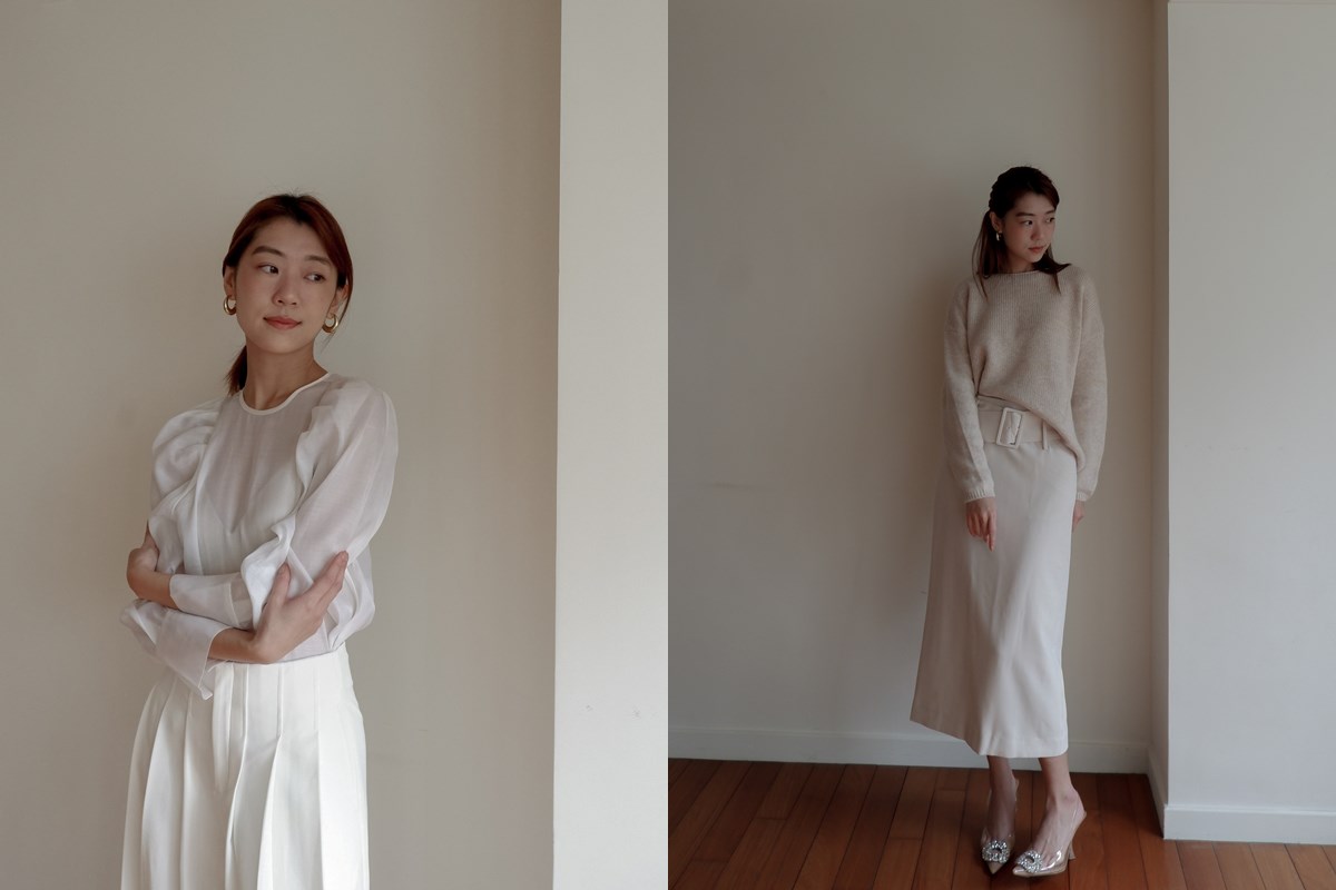 全白色系的穿搭能夠帶給人一種純淨無瑕的透明感,十分輕盈且舒適的氛圍感,但是相較於全黑色系的穿搭,要如何以白色做出不同層次的變化是更困難的挑戰。若是以純白色的單品來互相搭配的話,小技巧是運用不同面料的透膚度來提升整個視覺的差異。將秋冬單品【微透膚絲質光澤澎袖上衣】搭配【高腰壓摺落地西裝褲】,營造出虛實之間不同透明度的白色質感,以恰到好處的微透膚打造出鮮明層次的簡約時髦穿搭。若將整體的對比度調低,來打造更加溫柔優雅的風格的話,奶白色系穿搭就絕對錯不了了!被猶如棉花糖般的柔軟奶白擁入懷中,以浣熊毛和羊毛編織而成的【船領慵懶廓形羊毛上衣】,搭配知性氣質的【寬腰帶開衩高腰窄裙】,讓你在每天上班的日常也能輕鬆擁有法國的溫柔浪漫。