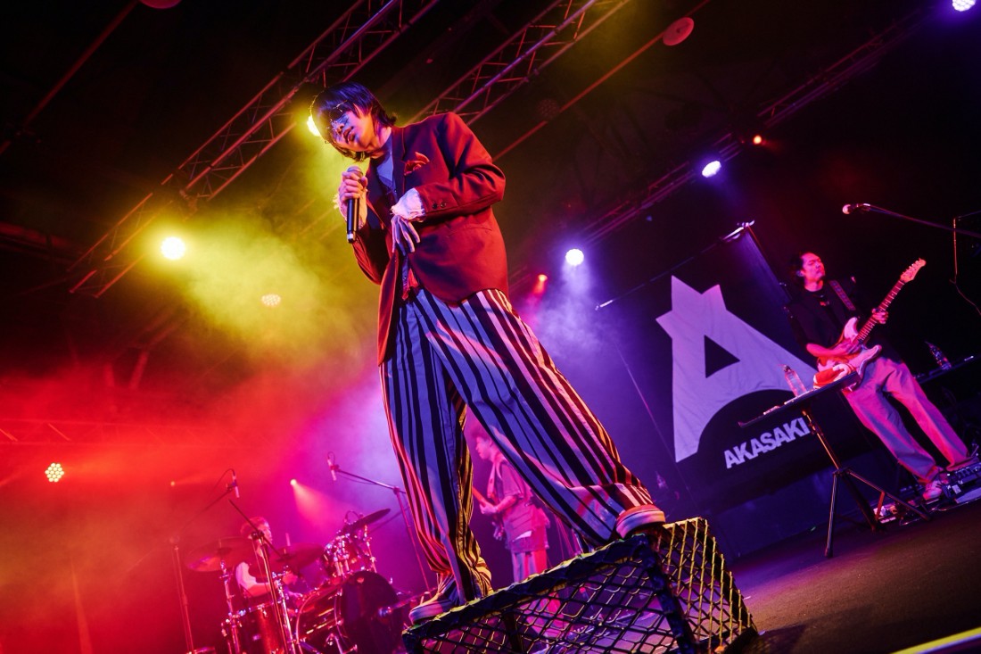 演出開場時,場館燈光瞬間暗下,僅剩強烈的心跳聲音效迴盪全場,營造出主角即將現身的緊張期待。現場1200位歌迷屏息以待,直到AKASAKI身穿猩紅色西裝外套與條紋長褲站上舞台,歡迎的尖叫聲瞬間爆發。他在舞台上自在搖擺,以〈徘徊〉與出道曲〈弾きこもり〉揭開序幕,俐落的台風與細膩的情感演繹,迅速讓全場沉浸於他的節奏與魅力之中。