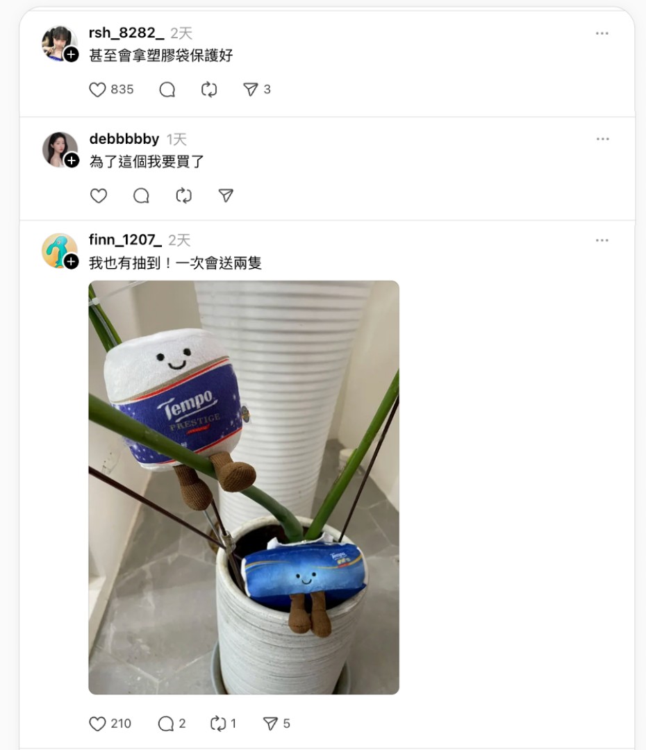 貼文曝光後,立刻吸引上萬網友熱烈轉發與留言。有人笑稱:「有記得給娃娃防水,他真的很喜歡」、「男友太可愛了」、「乍看有Jellycat的感覺」、「好想買一個送男友,香港都用這牌子」。更有網友嗅到重點:「娃娃是買衛生紙送的嗎?」接著立刻有網友神救援:「是Tempo的活動 單筆發票滿988用抽的」、「我也有抽到!一次會送兩隻」、「為了這個我要買了」。