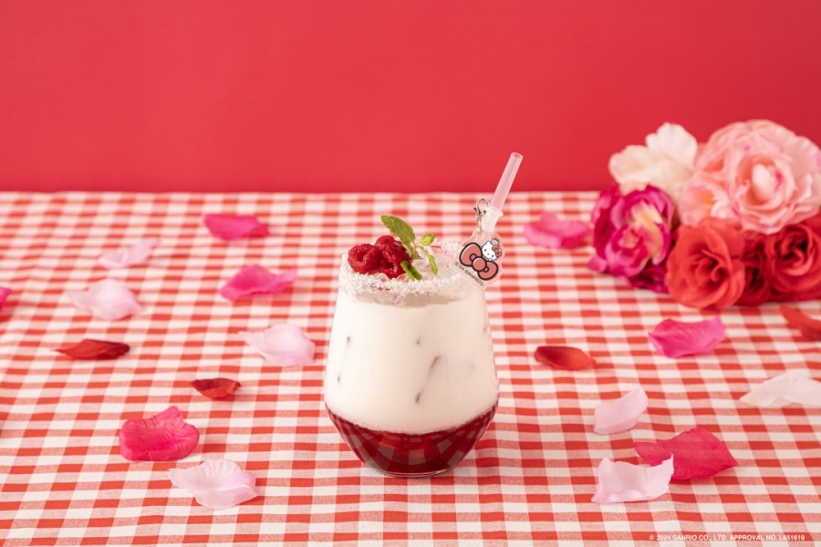 來到咖啡廳必點的特色飲品,包含能清楚可見草莓果肉的草莓牛奶、上頭使用覆盆子冰沙呈現蘋果形狀的蘋果石榴汽水,以及靈感來自於「Kitty&Mimmy」緞帶的草莓檸檬風味飲料。同時,還有提供咖啡、柳橙汁、可樂等基本品項。