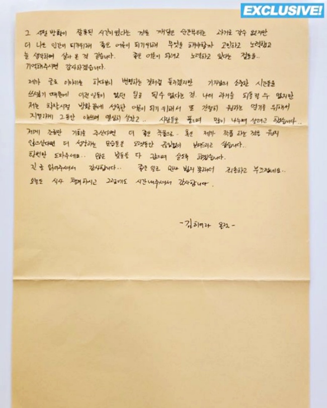 據悉金赫拉一度懇請D社延遲報導刊出的時間,為的就是怕影響他的新作品,今日稍早D社直接曝光「延後3個月才爆料」的真實理由,還原今年5月與當事人金赫拉在會議室裡、進行長達2個小時的對話後,署名寫給記者的親筆手寫信,同時表示:「因為當時金赫拉的認可以及反省,我們才等了3個月以上。」