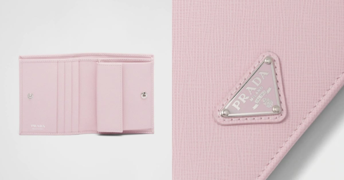 少見的柔嫩粉色皮夾以PRADA經典的Saffiano皮革打造,短夾正面搭配的品牌三角標鐵牌同樣也變成粉紅色的造型,雖然是兩摺的對開短夾革但搭配有3個信用卡插口、紙鈔隔層以及一個零錢收納袋,小巧精緻感超適合小包控的妞妞!
