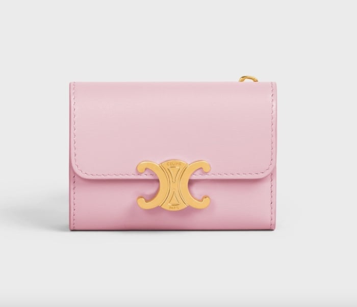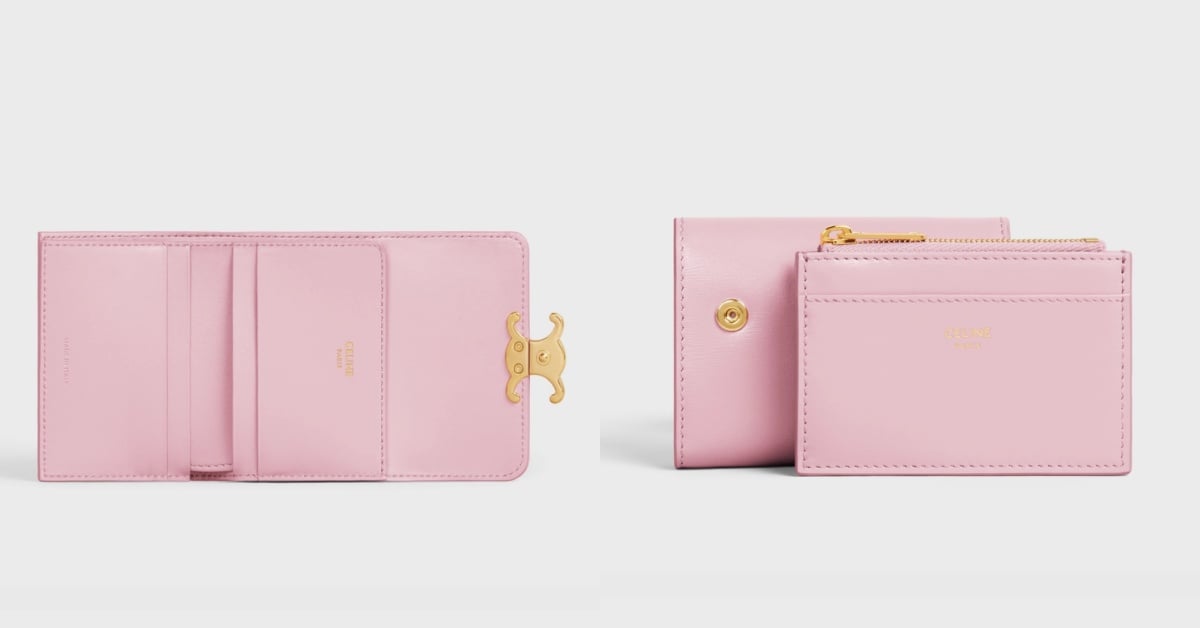 這次的粉色皮夾中最划算第一名!CELINE這款以亮面小牛皮打造的TRIOMPHE短夾,皮夾正面搭配的是大的金色凱旋門金屬釘扣用以開合錢包,內裡有4個信用卡插袋,以及一個紙幣收納空間,另外,這個短夾最方便的就是附上了一個以釘扣連接的零錢卡夾套!