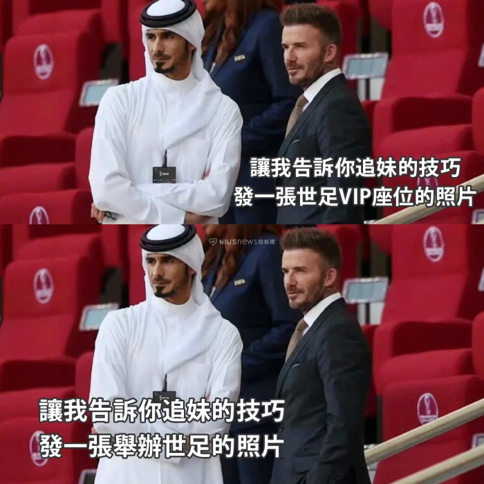 2022 年世界盃於西亞阿拉伯國家「卡達」正式登場!除了運動員在足球場上的熱血較勁之外,場邊的「富豪加油團」也是十分好看(笑)。擁有石油&天然氣開採權的阿拉伯皇室雖然十分富有,但在足球這項運動上仍有進步空間,因此觀眾們常常看到 VIP 座位區的霸總們(?)露出「付出鉅款卻得不到勝利」的哭哭表情包,為這場足球賽事增添了許多趣味~現在就一起來看看妞編輯為大家精選的「卡達世足賽搞笑迷因」盤點吧!
