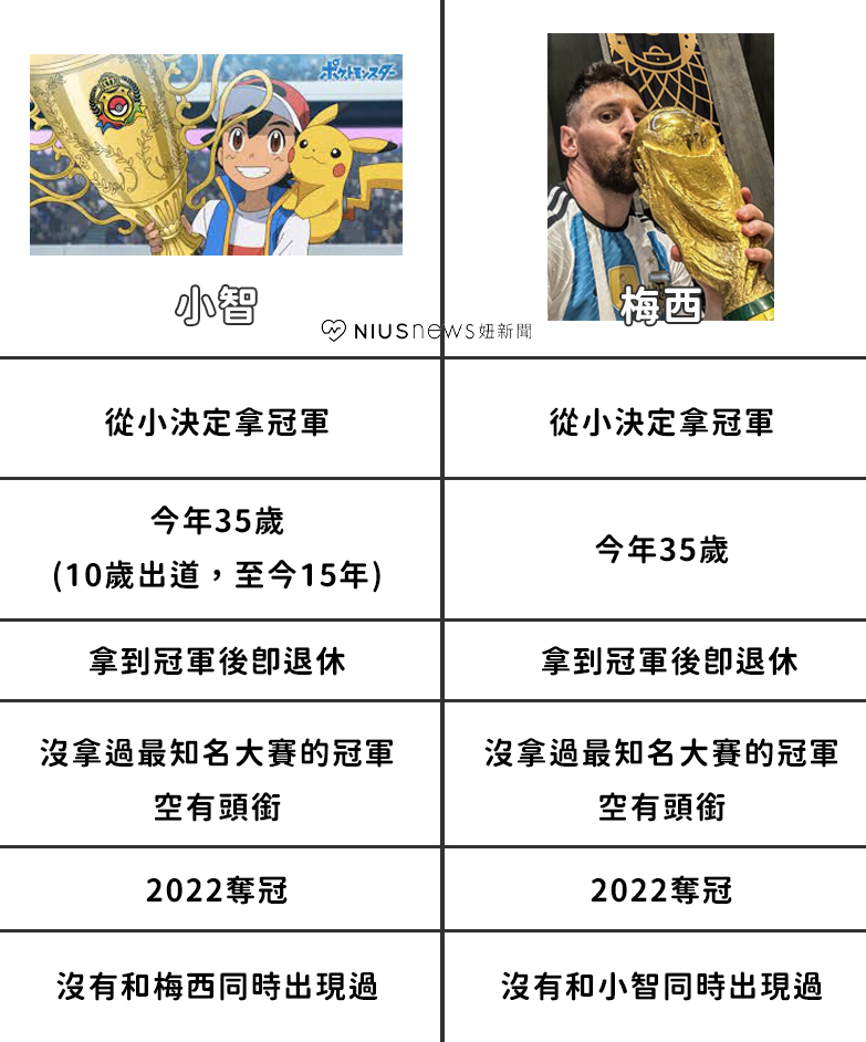 除了順利捧下金盃,網友也發現梅西的成長經歷竟與《寶可夢》小智驚人相似,就連藍衣服&金盃的模樣都堪稱神還原,原來梅西根本就是平行時空的小智啊!(妞編輯筆誤,小智是出道 25 年啦~)