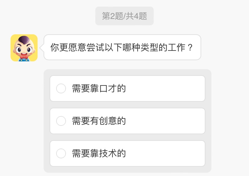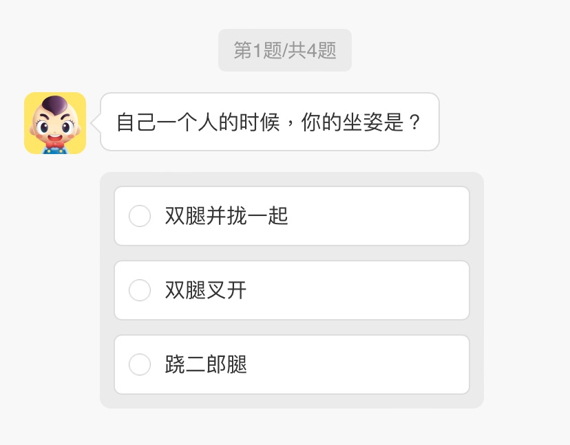 這次的題目總共4題,是從生活中各個方面去切入,從日常習慣的行為姿態,到內心傾向的工作類型,其實我們在日常生活中透過一個人的習慣坐姿也能大概推敲出對方基本的個性,像是日常中個性大喇喇的女生,在自己獨處時應該也比較少能保持謹慎優雅,妞妞們選擇哪一個呢?