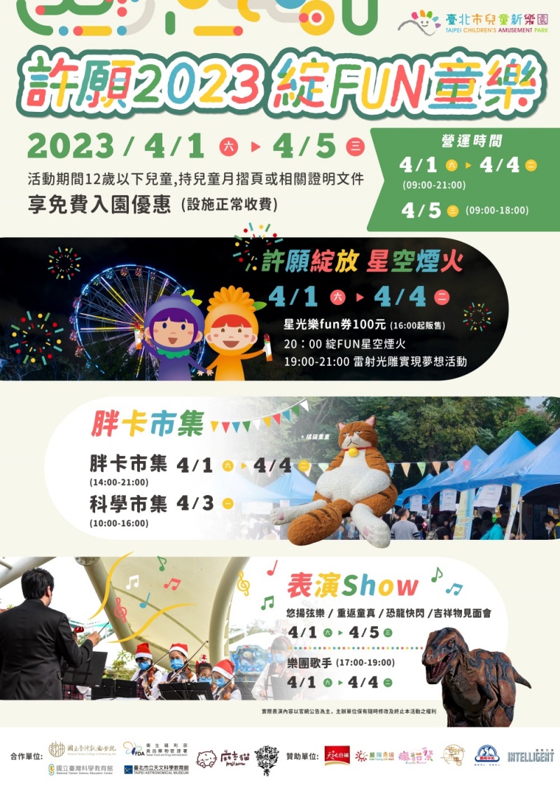 慶祝兒童節怎能少去了兒童新樂園!今年兒童新樂園一樣有參與2023臺北兒童月活動,12歲以下兒童憑兒童月摺頁或相關證明文件可免費入園,陪同的大人也優待免費1人(搭遊樂設施都還是要付費),4/1-4每天都有親子市集,更加碼白天音樂表演、夜間光雕秀、放煙火!如果只想晚上來看煙火,可購買兒童節限定100元「星光樂FUN券」,含當日門票及1-13號遊樂設施不限次數暢玩,很划算耶~