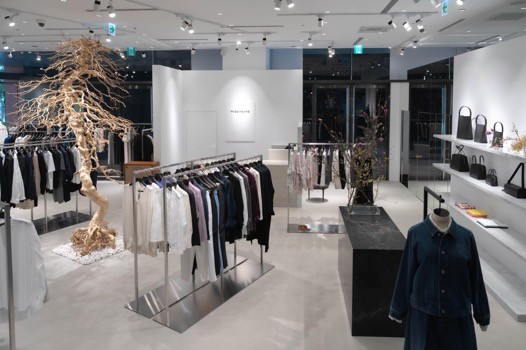 mizuiro ind 台北旗艦店佔地近 40 坪,整體設計走的是「無機質」風格,極簡的灰階地板搭配大理石檯面,逛起來非常寬敞舒適。最吸睛的絕對是店鋪中央那棵由日本藝術家「西畠靖和」打造的松樹枯枝藝術裝置,完美呈現了日式侘寂(Wabi-Sabi)的美學氛圍。