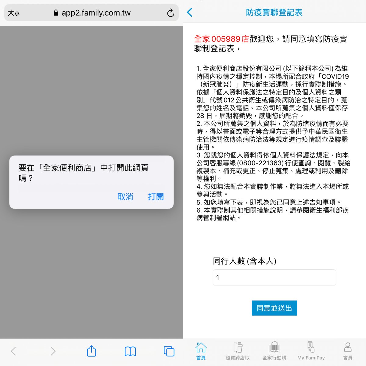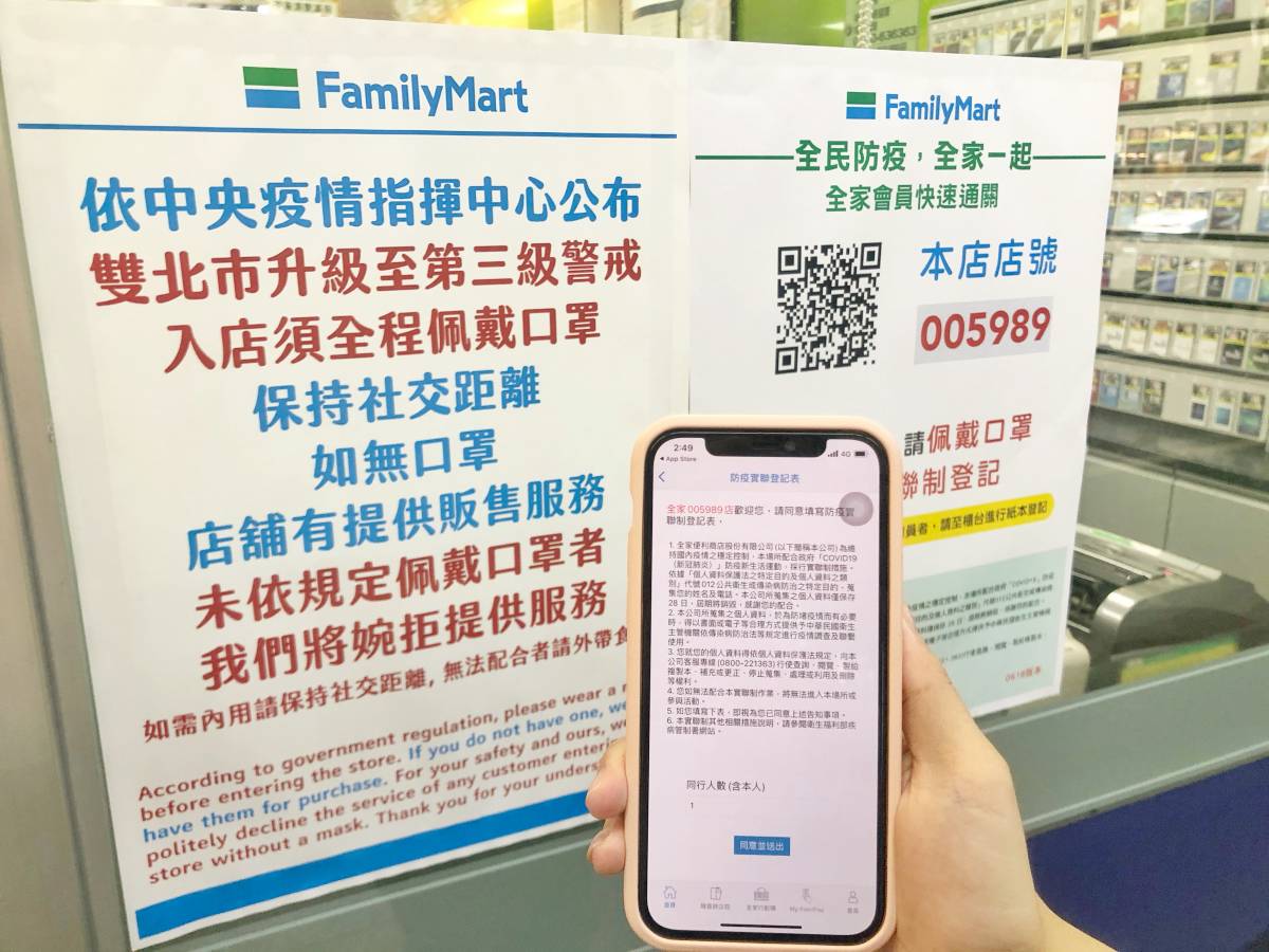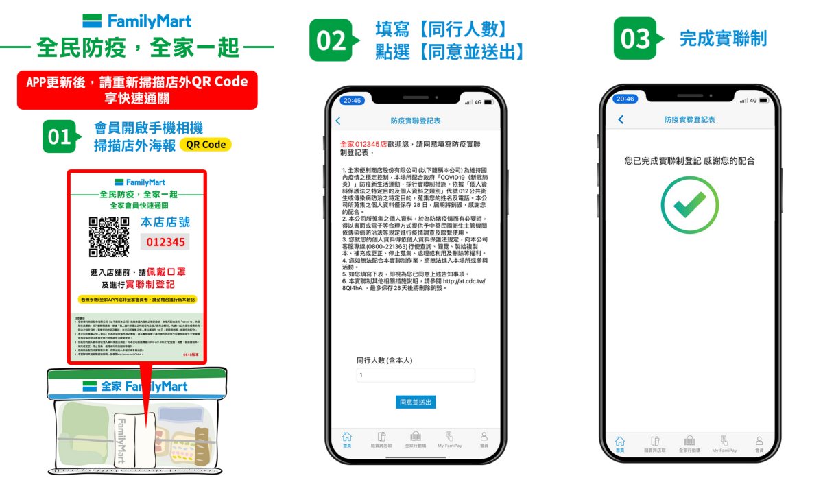 全家便利商店將會員App與「實聯制」做整合,現在用手機掃門市外的QRCODE,頁面會自動打開App《FamilyMart》,接著輸入同行人數即可入店,過程僅需10秒,超快速通關!