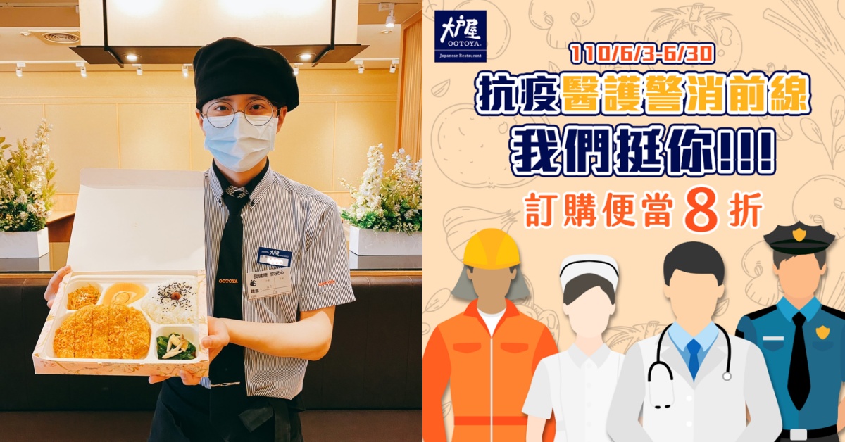 於即日起至6/30止,只要出示醫護警消識別證,前往大戶屋店舖外帶或撥打電話預訂外帶自取大戶屋便當,即可享「大戶屋便當8折優惠」,每單加碼再贈「大戶屋平日定食第二件6折券」一張(使用期限至2021/9/30),便當訂購滿20個,可免費外送到指定地點(離店舖方圓3km內),慰勞醫護警消人員的辛勞!此優惠適用全台家大戶屋分店。
