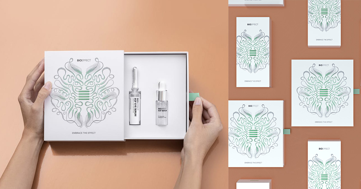 James Merry是享譽全球冰島音樂女神碧玉Björk的首席視覺造型師,設計靈感緣起於成分當中蛋白質的形狀和結構,進而聯想起飄逸的絲帶或絲線。希望藉由藝術創造,將微觀與宏觀的視覺概念相互融合,用以表達BIOEFFECT品牌背後的科技。此次使用刺繡的手法做為表現形式,融入銀色大麥元素,搭配啞光飾面的浮雕觸感效果,打造出美麗的紋理。並且遵循品牌綠色有機的理念,外包裝由FSC(Forest Stewardship Concil,森林管理委員會)批准使用的純木漿紙張製作而成。