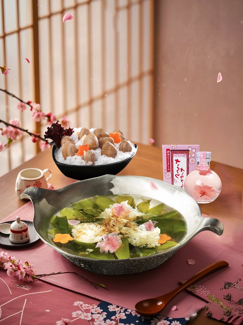 本次活動湊湊特別推出全新鍋底「櫻花昆布清酒鍋」,以北海道昆布與鰹魚細火熬煮,萃取日式高湯的純粹甘甜,融合文蛤的濃郁海味,層層堆疊鮮美層次。特別加入鹽漬櫻花,淡雅花香隨著湯頭緩緩綻放,再佐以櫻花蝦釀造的純米吟釀,帶來細緻的米香與微醺柔和的口感,讓每一口都如同春日晨曦般輕盈溫潤。