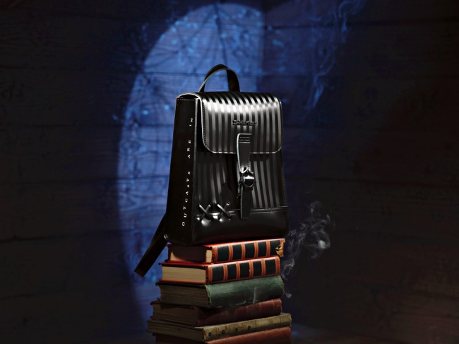 聯名後背包同樣延續「黑、灰條紋設計」,硬挺的硬挺皮革增添英倫正式感,同時結合皮革鞋帶、蜘蛛網形扣環、彩繪玻璃吊飾及紫色學院內襯,奈落學院確定不採納量產變成第二季的制服配件(笑)?別忘了帶上黑灰色過膝條紋襪,以上系列全部穿上身,秒變身星期三本人。(另外,Dr. Martens各百貨櫃點指定品牌日單筆消費滿NT.3,000元現抵NT.30、滿NT.5,000抵NT.700;週年慶活動期間單筆消費滿NT.5,000元現抵NT.600、消費滿NT.6,000加贈SHOEX限量鞋拔乙件喔~)