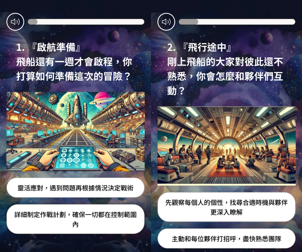 第三題「飛船突然遭受攻擊,系統出現故障時,你會如何應對?」是先安撫夥伴,再進行修復,或是迅速檢查損壞程度,分析出最佳方案?第四題描繪「你們被迫將在一顆充滿怪異齒輪和機械的神秘星球,在面對未知時,你的想法是?」兩個選項涵蓋真是太奇妙了、好令人不安。