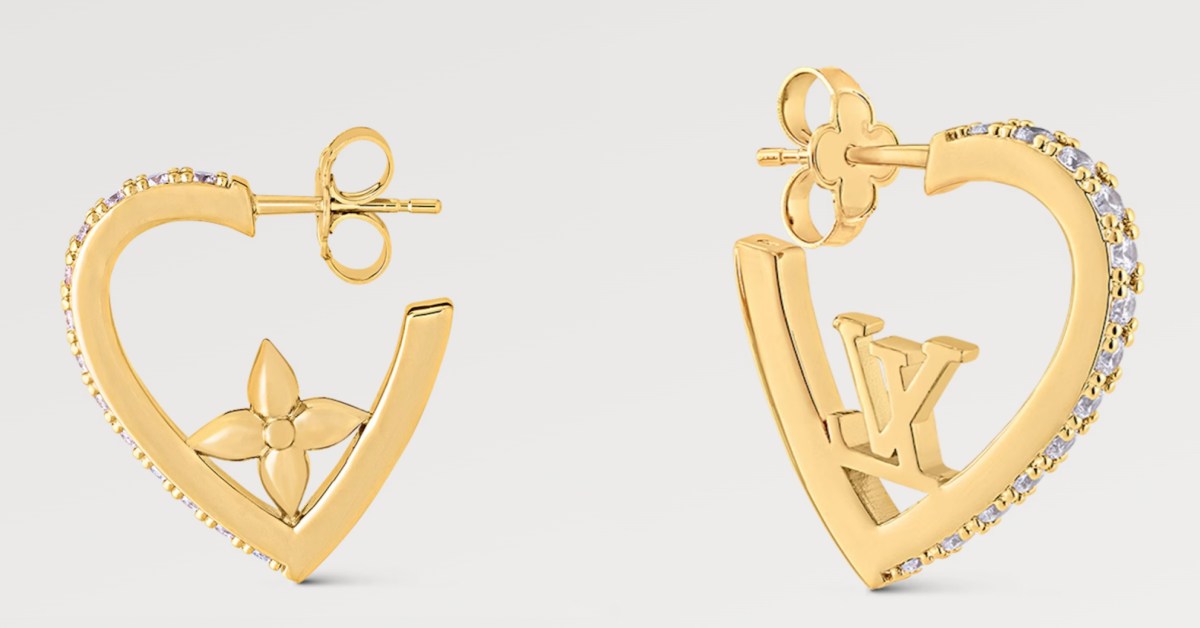 女孩們的浪漫自己給!(笑) 這款名為「My LV Love」的耳環雖然是特別為情人節而設計,但作為自用或是姊妹送禮也很適合,心形圈環正中懸掛以金色金屬鑄造的Monogram花卉圖案,邊緣點綴閃爍迷人的水晶,左右耳不同圖案的設計更加有巧思!