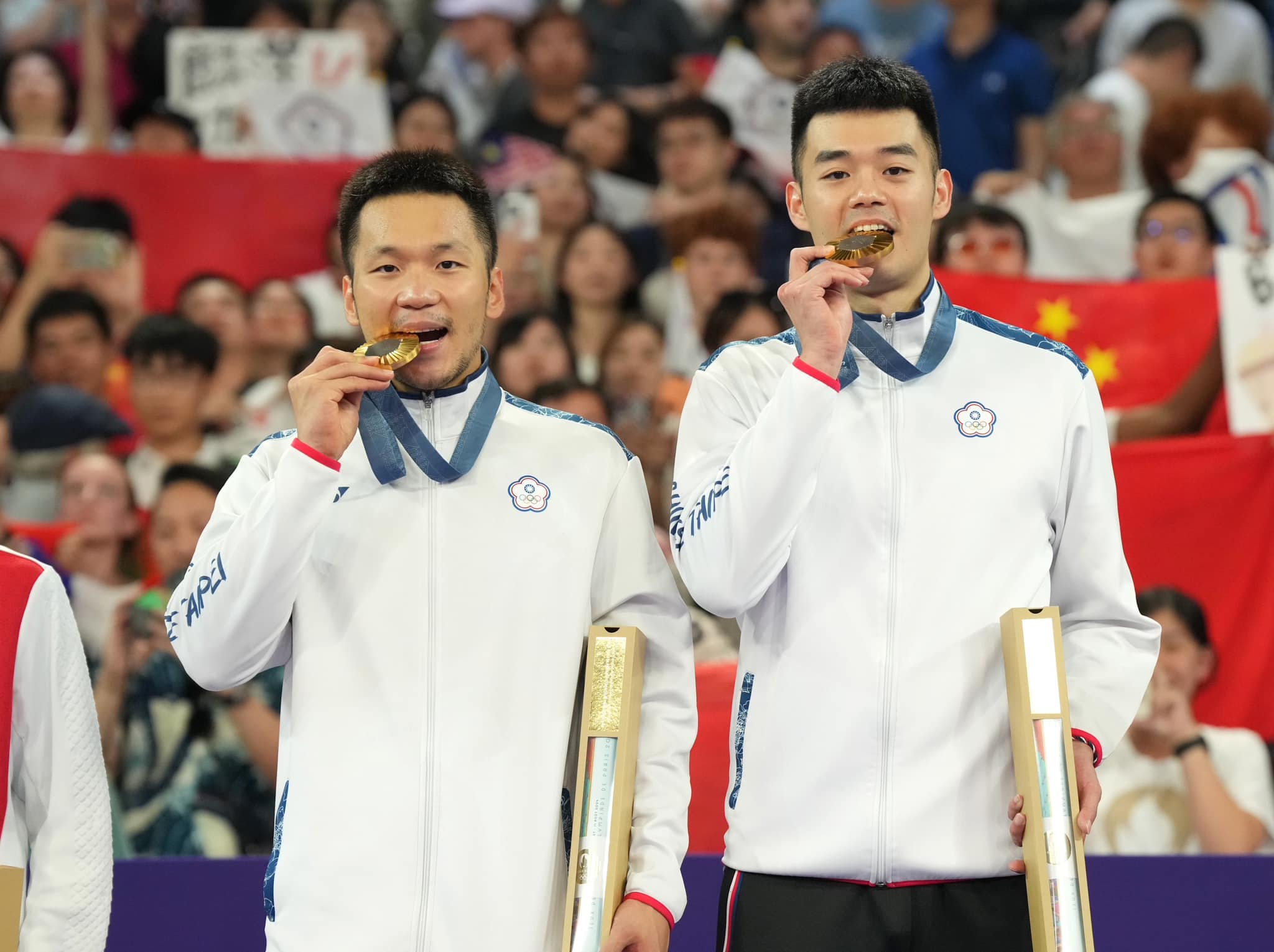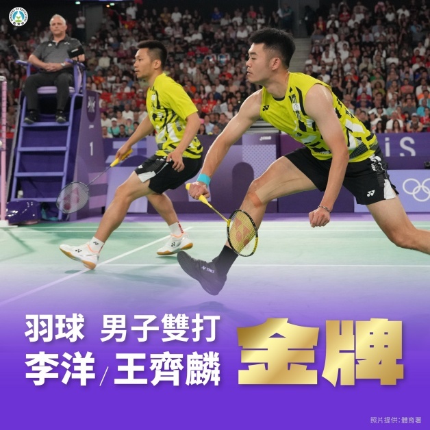 中華隊由上屆東奧黃金男雙「李洋、王齊麟」出擊,身為金牌衛冕者的他們二度叩關五環殿堂,麟洋配小組賽四場四連勝,金牌戰再度面對中國組合,強碰大會頭號種子梁王組合「梁偉鏗、王昶」,以21:17、18:21、21:19「2:1」勇奪金牌,不僅是奧運跨屆12連勝,更完成二連霸,成為奧運史上男雙首對創舉,聖筊組合又鍍金。從東京奧運的高峰,麟洋配陷入三年的低潮,再度走向巴黎奧運的高峰,李洋和王齊麟又做到。28歲的李洋確定今年賽季後退休,光榮高掛球衣!(麟洋配拿金牌啦!羽球男雙「李洋、王齊麟」奧運史上首對二連霸,2:1贏中國梁王組合)